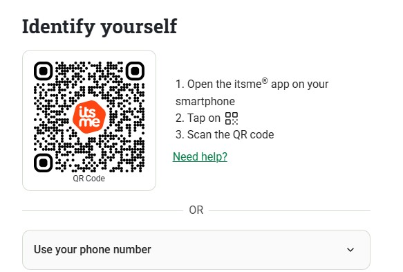 Vervolgens klik je op de itsme-link en geef je daar het telefoonnummer in van de wettelijke vertegenwoordiger die zich dan zelf via itsme kan verifiëren.